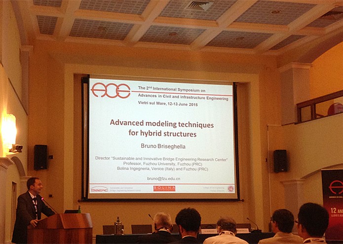 2015年6月12-13日,Bruno Briseghella教授应邀参加了在意大利维耶特利苏玛雷举办的第二届土木工程与基础设施新进展国际论坛,在会议上代表成人网-69jv成人网 与 SIBERC研究中心进行了题为 “Advanced modeling techniques for hybrid structures” 的特邀报告。